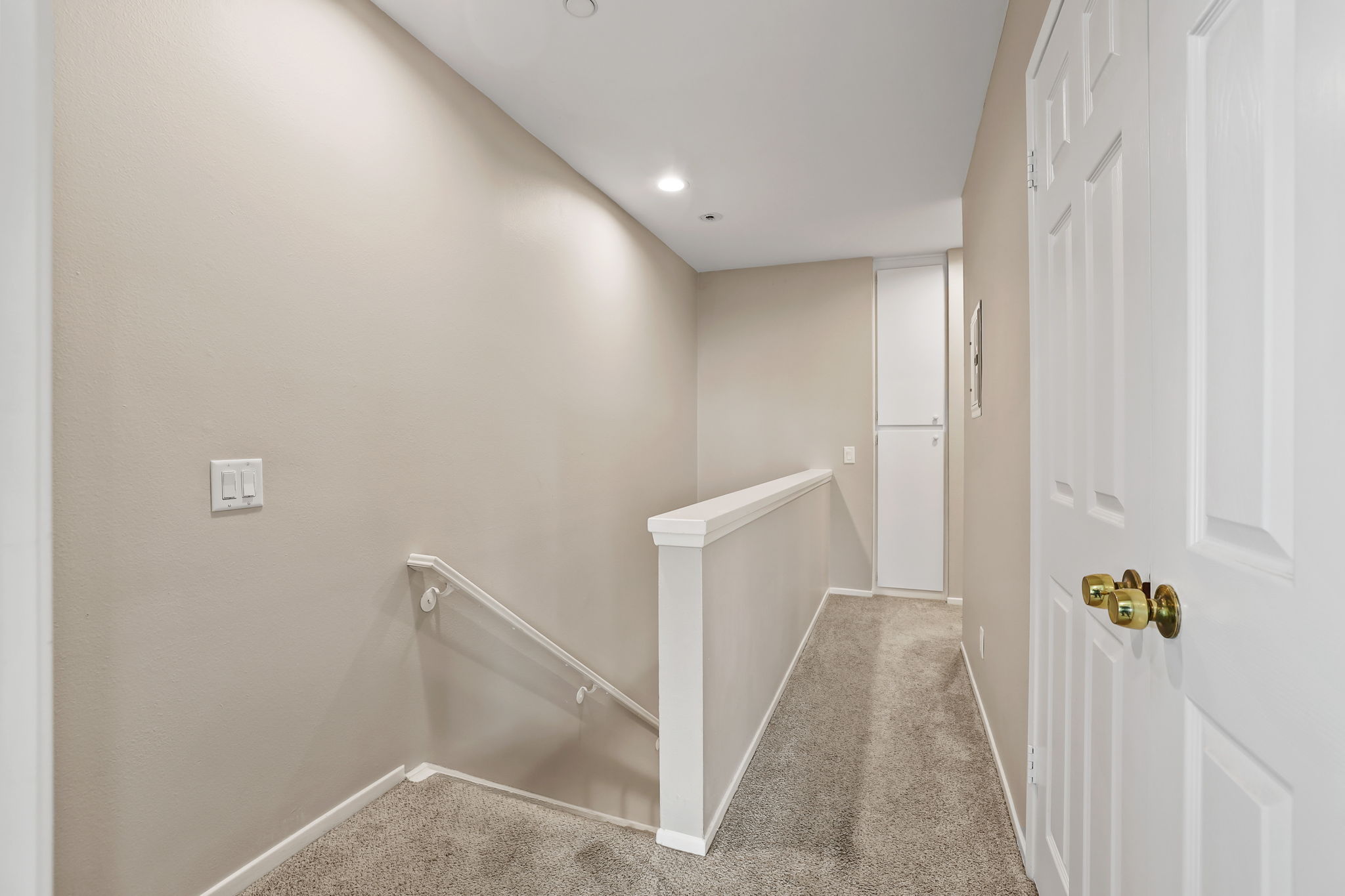 - Wood-look tile flooring downstairs and comfortable carpeting upstairs.