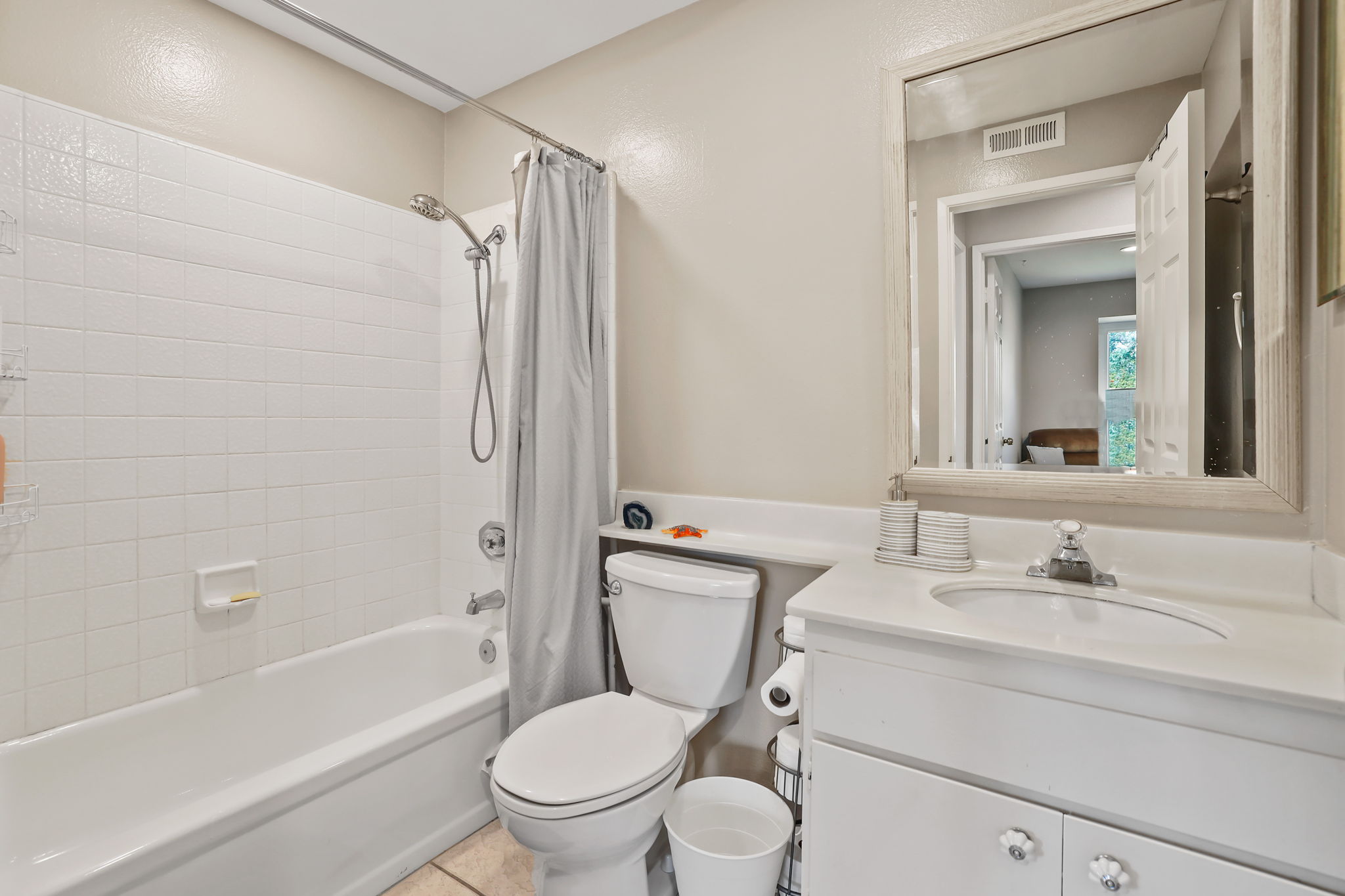 Upstairs, the primary suite is notably spacious and offers a calm retreat at the end of the day. Large enough to accommodate a full bedroom set with room to spare, it also features peek-a-boo ocean views and a generous walk-in closet. The remodeled bathroom includes a walnut vanity, designer tile, and subtle Art Deco touches that bring just the right amount of personality. Two additional bedrooms provide flexibility for family, guests, or a sunlit home office. A second full bathroom serves the hallway, and a full-size laundry area upstairs keeps chores simple and close at hand.