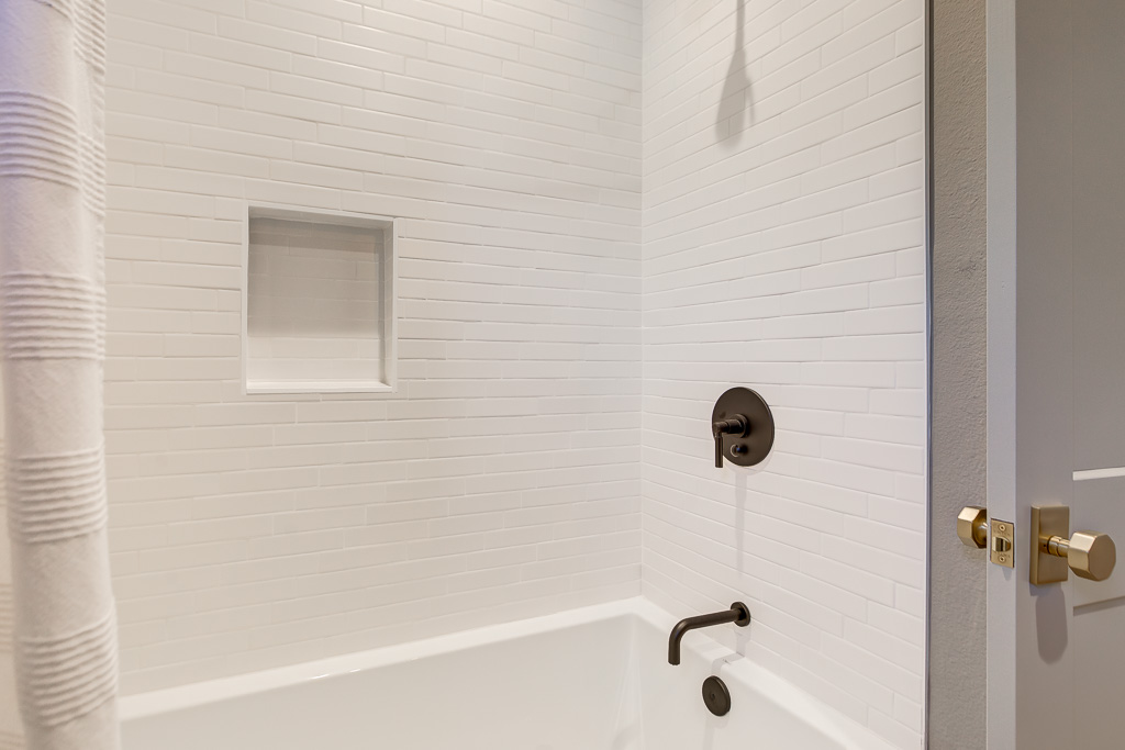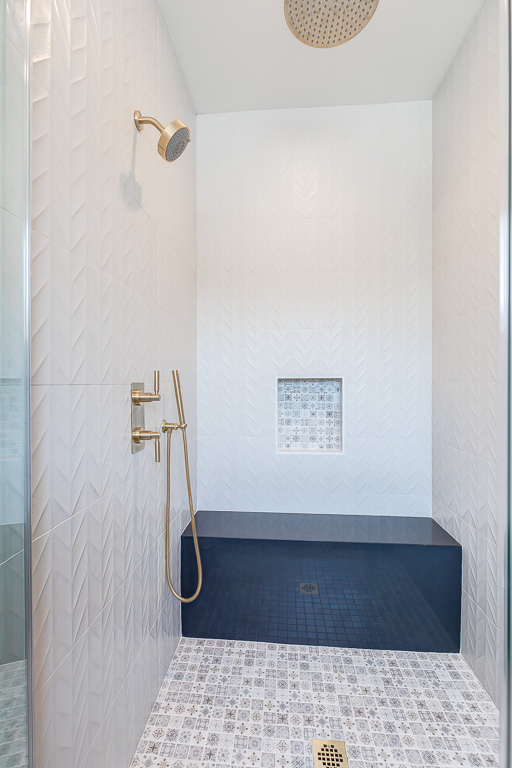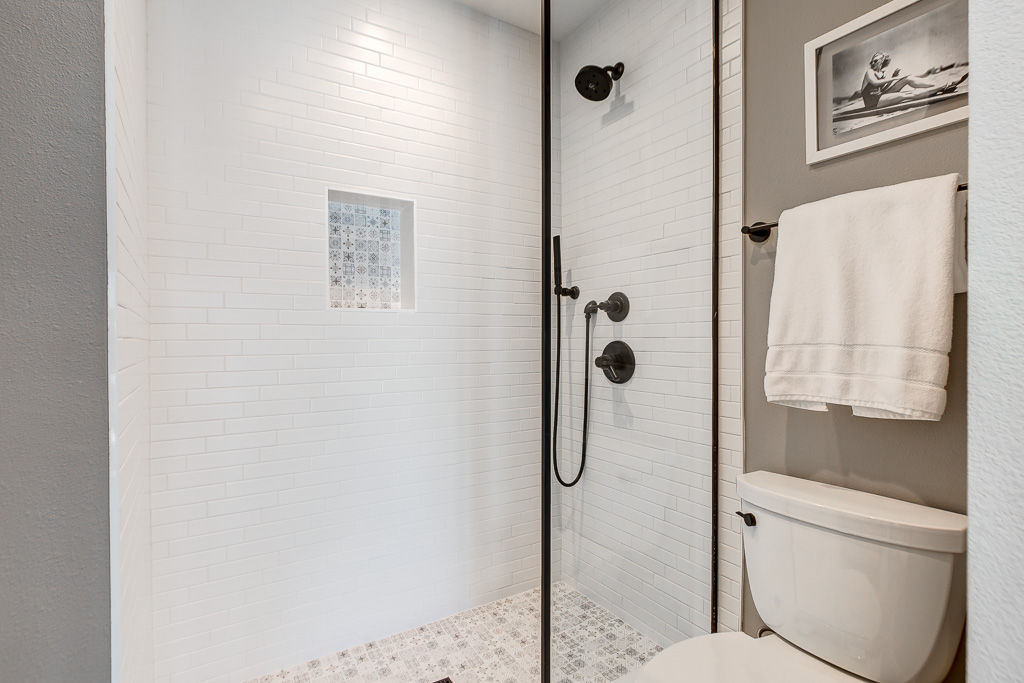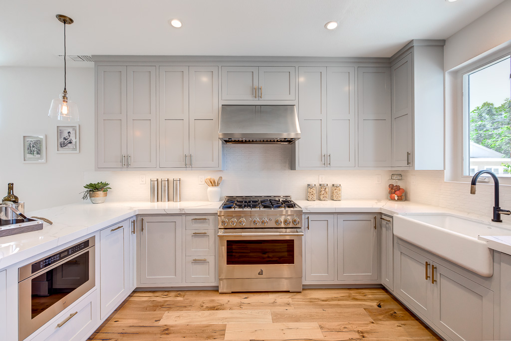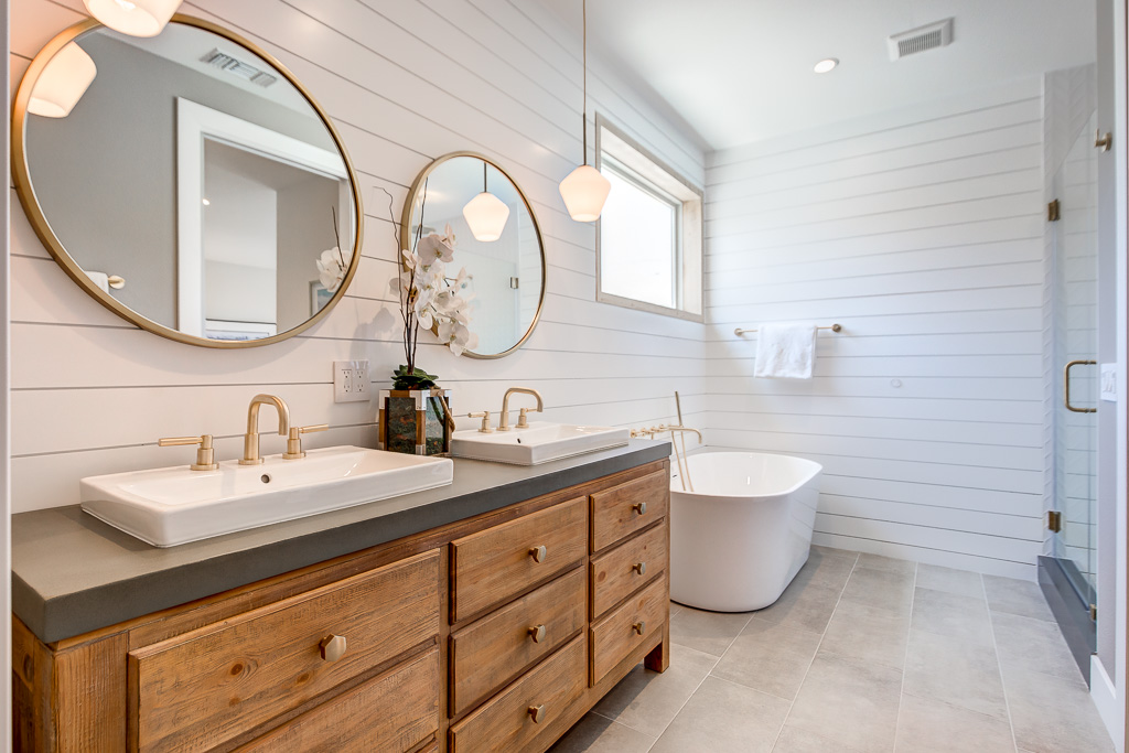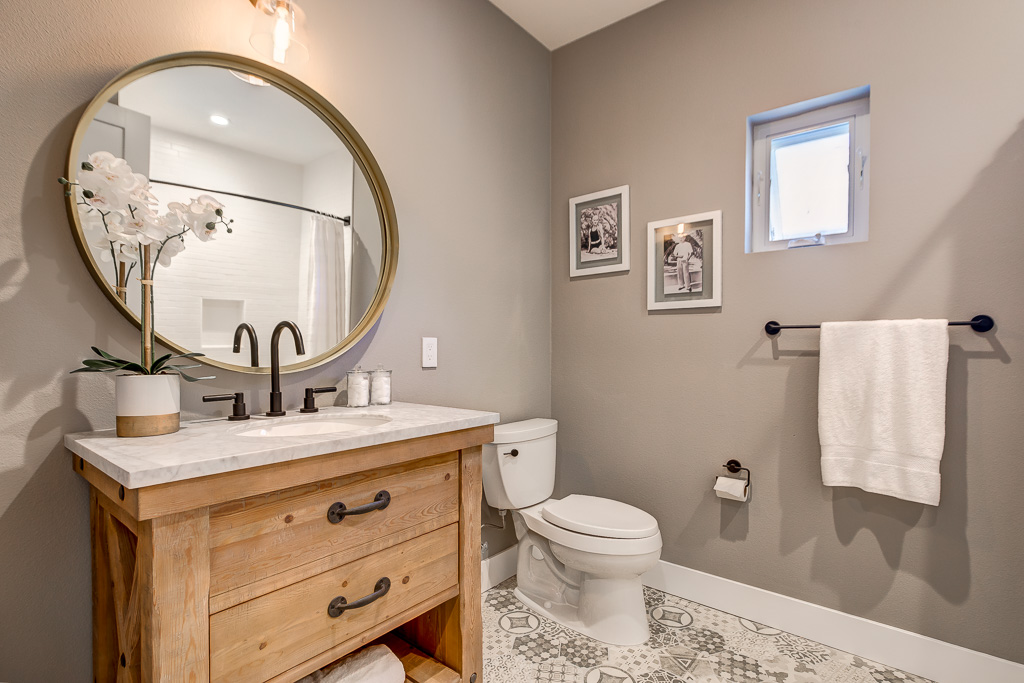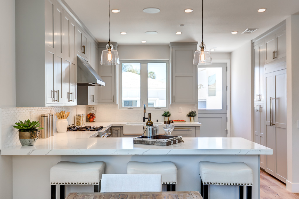 Custom Inset Shaker cabinetry throughout both kitchens. Designer vanities from Pottery Barn in the bathrooms, accented by lighting and mirrors from Crate & Barrel.